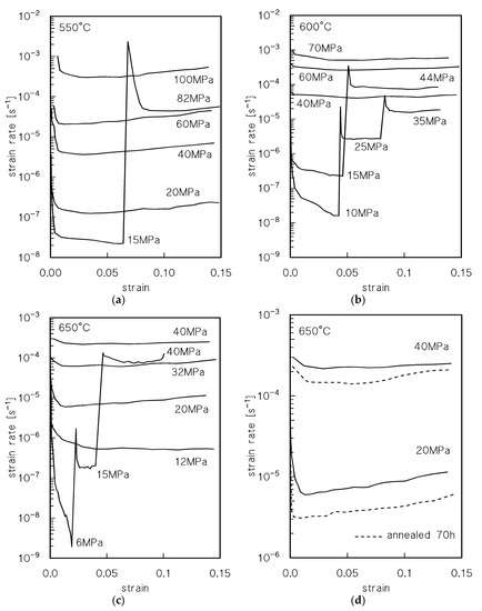 Strain rate vs. strain creep curves: (a) 550 °C; (b) 600 °C; (c) 650 °C; (d) 650 °C, effect of annealing for 70 h before loading at the testing temperature.