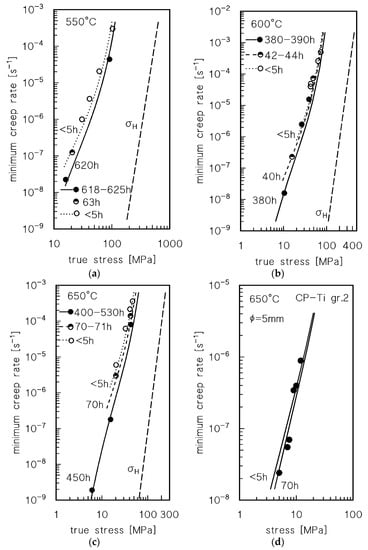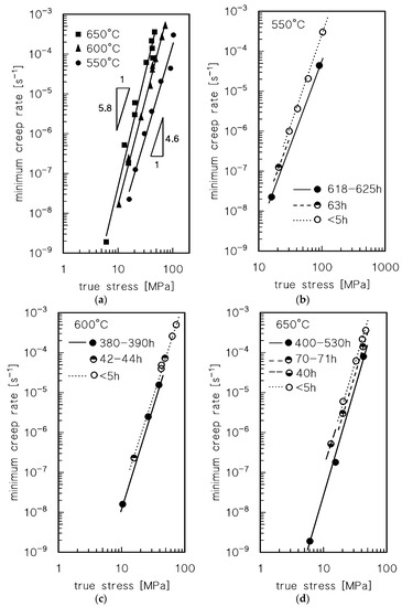 Minimum strain rate as a function of true stress: (a) all experiments; (b) 550 °C; (c) 600 °C; (d) 650 °C. In (b–d), symbols are differentiated according to the duration of high temperature exposure in correspondence with the minimum creep rate.