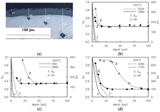 (a) Microhardness measurements in the VLE sample tested at 650 °C for 625 h; (b–d) microhardness (circles) and calculated profile of oxygen (XO parameter, curves) for the longest tests at 550 °C (b), 600 °C (c), and 650 °C (d).