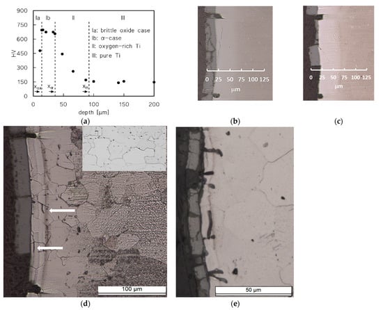 Figure 4a replots the hardness profile of the sample head that experienced the longest permanence at 650 °C (528 h). The figure also includes the value of the hardness in correspondence with the oxide surface layer, omitted in Figure 3d. The figure shows the existence of four different zones: i. the oxide surface layer (Ia), which cracks even under the HV indenter and, possibly for this reason, exhibits a relatively low HV value; ii. an intermediate zone (Ib) of an almost constant and very high (roughly 700 HV) microhardness—these HV values, in oxygen-rich Ti, are known to correspond to very low ductility [13], hardly capable of tolerating any notable deformation [2]—iii. a zone of decreasing hardness (II); iv: the unaltered core of the sample. For the sake of clarity and simplicity, we will assume in the following paragraphs that zone-Ib corresponds to what is usually called the “α-case” in Ti and Ti alloys. Figure 4b–d shows extensive cracking in the oxide layer, which is detached from the underlying oxygen-rich zones. Many wide cracks, perpendicular to the loading direction, pass through zones Ia and Ib. Finer cracks also develop in zone Ib, but propagate along directions parallel to the surface. Figure 4d shows the different metallographic contrast after etching between the base metal and the oxygen-rich surface.