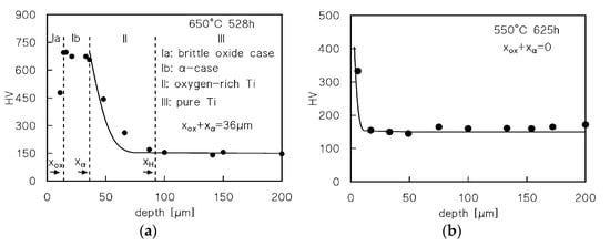 where HV0 is the hardness of the metal with the initial oxygen concentration, HVmax is the maximum hardness, and HVx is the hardness at the distance x from the point where HVmax is measured, usually the surface. Equation (4) implies the same parabolic relationship between microhardness and oxygen concentration obtained in [7], so that a constant HV corresponds to a constant oxygen content. On the other hand, based on the above reasoning, both the oxide layer/zone Ia (thickness xox) and the “α-case”/zone Ib (thickness xα) do not significantly contribute to creep strengthening. Rather, Equation (4) could be tentatively used to quantify the hardness variation with depth in zone II, under the layers of depth (xox + xα). Figure 5 plots the variation in hardness and depth according to Equation (4), with HVmax = 700 HV and HV0 = 150 HV. The correlation between the curves and the experimental profiles is reasonably good, so Equation (4) can be used to estimate the depth of the hardened, oxygen-rich zone II, which causes a significant reduction in the creep rate. The limit for this layer was here tentatively quantified as the x value corresponding to XHV = 0.01.