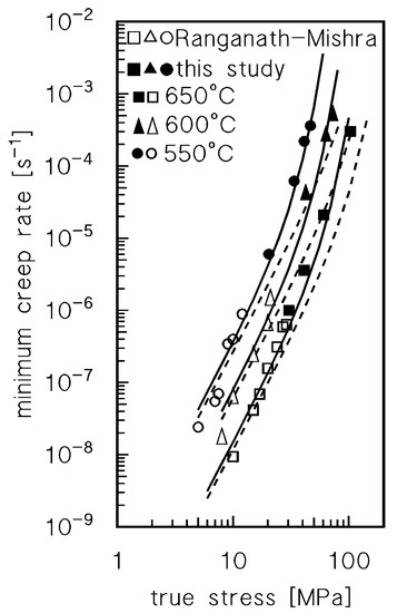 where AH and n, in this simplified approach, are constant, and QH is the apparent activation energy. For the sake of simplicity, it will be supposed here that QH is also stress and temperature independent. In the case of the VLE at 650 °C, the three data points correspond to times of exposure of 400, 513, and 530 h, while for the VLE at 550 °C, the two values of the minimum creep rate were obtained after 618 and 625 h. Equation (4) was then used to estimate xH for XHV = 0.01 after 450 h at 650 °C and 620 h at 550 °C, which provided fH and fS. For a given strain rate, σS is obtained directly from Equations (5) and (7). The model parameters AH, n, and QH were thus tentatively estimated using a fitting procedure of the VLE data at 650 °C and 550 °C.