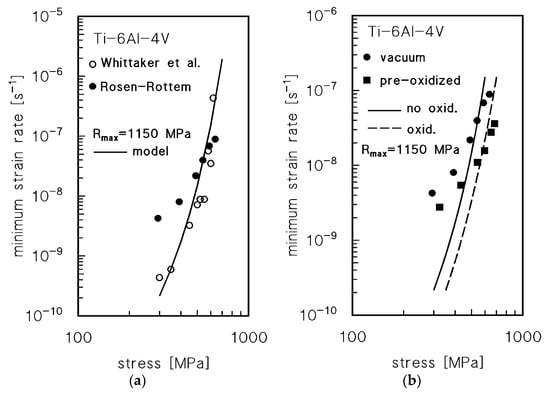 (a) Minimum creep rate 400 °C for the Ti-6Al-4V alloy annealed at 900 °C for 3 h in vacuum [3] and for a similar alloy with bimodal α + β microstructure [22]. The model curve (no effects of oxygen) was calculated using Equation (5) with D0L = 1.4 × 10−3 m2s−1, QL = 303 kJ mol−1 [17], Rmax ≈ 700 MPa and A = 50. (b) Rosen and Rottem data [3] from VLE at 400 °C for the Ti-6Al-4V annealed at 900 °C for 3h in a vacuum or in air. The curves represent the behavior of non-oxidized and oxidized alloys (see text for details).
