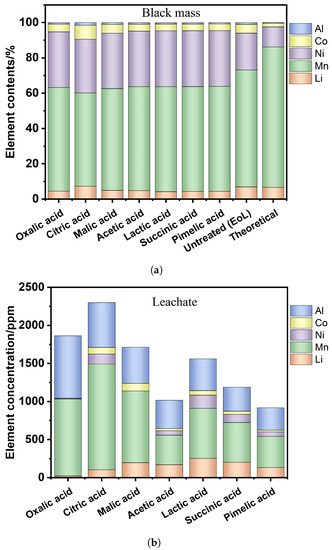 To compare the effectiveness of the process, the amount of transition metals leached and the lithium content were compared in the recovered black mass and in the leaching solution. The % content of the black mass is illustrated in Figure 1a. For the theoretical cathode material, it was assumed that the material is 75:25 LiMn2O4 and NCA, respectively, and from this, the elemental mass was calculated. This was compared to the elemental content in the untreated and acid-delaminated materials. It is clear that manganese was preferentially leached in all cases, with some significant differences in the manganese content after delamination. This was similar in observation to other selective leaching processes that were developed previously [45,46,47]. Figure 1b shows the ICP-OES results for leachate solution. Here, we can observe the high levels of manganese and aluminium, again illustrating selectivity in the leaching of the elements. All the acids used during this study leach lithium to some extent.