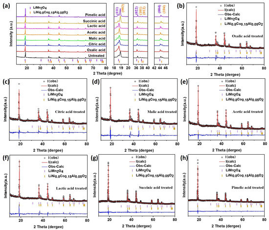 The XRD patterns of the recovered powders from the acid treatments show similar patterns compared to pristine untreated material (Figure 2a). However, minor changes in the main characteristic peaks belonging to LMO and NCA can be observed in the enlarged patterns. The changes in peak positions and intensities can be explained by the loss of metals due to acid leaching. Previous reports have mentioned that acids are selective for the leaching of metals, leading to the difference in the final composition and crystal phase [48]. To confirm this, Rietveld refinement was conducted using the GSAS software, and the results are shown in Figure 2b–h and Table 5. The pristine cathode is composed of LMO and NCA in a 3:1 ratio. Table 5 shows that the phase fraction of powder treated with oxalic acid is the closest to the designed ratio of 3:1, which means that the fewest metals were leached during the separation process. This was also verified by the ICP data discussed above. Powders treated with citric acid, malic acid, and acetic acid maintain their original structure. Significant changes in the crystal structure were observed after treatment with lactic acid, succinic acid, and pimelic acid.