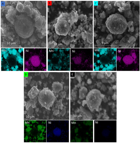 SEM micrographs of acid delamination recovered black mass powders, with manganese and nickel areas highlighted. (A) acetic, (B) citric, (C) lactic (D) malic, and (E) oxalic acid. Manganese in teal and green. Nickel in pink and blue.