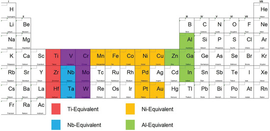 HEAs are required to contain at least five different types of alloying elements. Moreover, the content of each atom lies between 5 and 35 atomic percent [24]. For HESMAs, two or more other alternative elements are introduced to partially replace the initial SMA composition. Therefore, it is essential to select substitute elements that possess good solubility and similar electronic configurations to the primary elements [25,26,27]. Figure 1 displays the equivalent elements for the five principal chemical elements in SMAs, which can promote the development of new types of shape-memory alloys in the future.