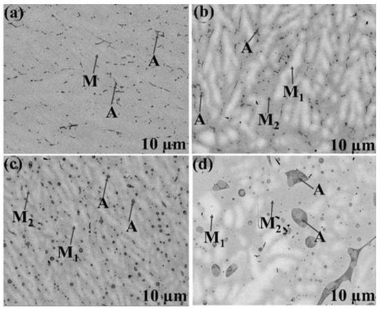 SEM image of (a) 50(TiZrHf), (b) 50.5(TiZrHf), (c) 51(TiZrHf), and (d) 52(TiZrHf) [45].