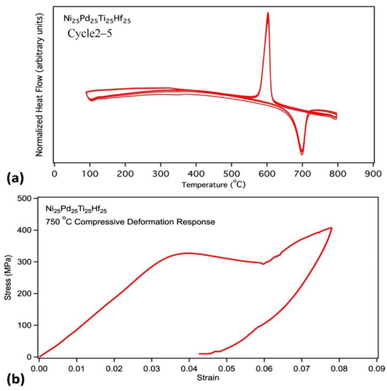 Canadinc et al. [52] investigate the distinction among Ni35Pd15Ti30Hf20, Ni25Pd25Ti25Hf25, and (TiZrHf)50(NiPd)50 high-entropy shape-memory alloys. It is found that high-entropy shape-memory alloys containing quaternary or quinary alloying elements have a higher martensitic transformation temperature (≥773 K) compared with TiNi-based high-temperature shape-memory alloys. Among them, the transformation temperatures of (TiZrHf)50(NiPd)50 high-entropy shape-memory alloys exceed 973 K, as shown in Figure 5. Both Ni35Pd15Ti30Hf20 and Ni25Pd25Ti25Hf25 shape-memory alloys show a certain high-temperature superelasticity. As shown in Figure 6a,b, the loading stress and strain recovery rate of Ni25Pd25Ti25Hf25 alloy (400 MPa and 3.5%) are higher than those of the Ni35Pd15Ti30Hf20 alloy (210 MPa and 3%). In summary, (TiZrHf)50(NiPd)50 high-entropy shape-memory alloy has a higher martensitic transformation temperature, larger transformation stress, and higher strain recovery rate at high temperatures. However, the high cost of a large amount of Pd elements is another key issue that needs to be addressed.