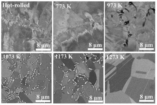Different hot rolling and annealing temperature Fe47.7Mn15.5Co9.8Cr10.8Ni5.1Si11.1 alloy BSE image [62].