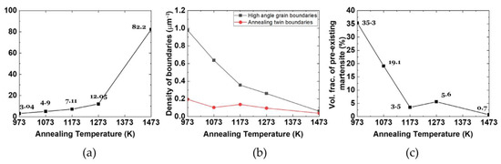 (a) Grain size of samples annealed at different temperatures. (b) Variation of high angular grain boundary density and annealing twin density with annealing temperature. (c) The volume (area) fraction of epsilon martensite varies with annealing temperature [64].