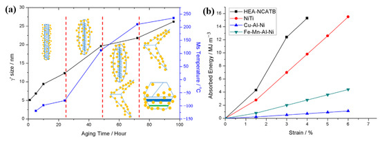(a) The variation of γ ‘size and initial martensitic temperature of NCATB-HESMAs aging at 973 K with aging time and the martensitic morphology of γ′ precipitated phase at different aging times. (b) The energy absorbed by NCATB-HESMAs (aged at 973 K for 5 h) and some other alloys in a superelastic cycle as a function of tensile strain [66].