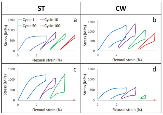 Ti30Hf19Zr25(NbTa)26 (a,b) and NiTi (c,d) alloys in solution treatment state (ST) and cold working state (CW) are at 473 K; Three-point bending test results under different cycles [25].