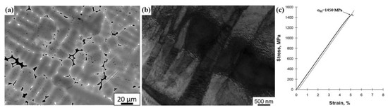 Co31.22Ni29.26Cu11.95Al16.64Ga10.39In0.55 BSE image (a), B2 and L10 martensite crystal (b), transmission electron microscopy image compression stress–strain curve (c) [75].