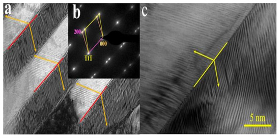 The current research on high-entropy shape-memory alloys is mainly focused on Ni-Ti-based high-entropy shape-memory alloys. However, in order to meet various requirements, other types of high-entropy shape-memory alloys also have been paid increasing attention. For example, Gerstein et al. [75] successfully developed a new Co31.22Ni29.26Cu11.95Al16.64Ga10.39In0.55 high-entropy shape-memory alloy on the basis of Ni-Al-based shape-memory alloys. The present high-entropy shape-memory alloy has a mixture of B2 austenite and L10 martensite structures, as shown in Figure 13a–b. The forward phase transition starting temperature (TMs) and the reverse martensitic transformation temperature (TAf) are 875 K and 890 K, respectively. Notably, the present CoNiCuAlGaIn high-entropy shape-memory alloy has a matrix yield strength of 1450 MPa, as displayed in Figure 13c. In addition, there appears the original research on high-entropy ferromagnetic shape-memory alloys. Ju et al. [76] designed Ni-Mn-Ga-Co-Gd high-entropy ferromagnetic shape-memory alloys. The results show that β, γ, and martensitic phases exist in the microstructure of A1-A4 alloy, with the change in Co and Gd elements, the γ phase gets smaller, and the martensitic phase gradually replaces the matrix β phase; secondly, with the change in Co and Gd elements, the valence electron concentration of the alloy gradually increases, which leads to a gradual increase in the martensitic phase transition temperature to 300 °C, which increases the possibility of ferromagnetic shape-memory alloys for high-temperature applications. As shown in Figure 14a, the morphology of the alloy martensite exhibits typical L10-type twinning characteristics, and the driving force for rearrangement strengthening of these twinned martensites decreases, so the magnetic-field-induced strain of the alloy shows an increasing trend with the change in Co and Gd elements. Ju et al. [77] also investigated the effect of thermomagnetic drawing on the performances of Ni20Mn20Ga20Gd20Co20 high-entropy ferromagnetic shape-memory alloy Compared with the original Ni20Mn20Ga20Gd20Co20 high-entropy ferromagnetic shape-memory alloy prepared via arc melting, the phase transition temperature is increased to 873 K under a magnetic field of 0.5 T as a result of thermomagnetic drawing. The present high-entropy shape-memory alloy subjected to thermomagnetic drawing shows a typical L10-type twin martensite, and the internal twins are (111) twinning related, as shown in Figure 14b. Due to the evolution of the twin martensite and the enhancement of the driving force, the magnetic field-induced strain of Ni20Mn20Ga20Gd20Co20 high-entropy ferromagnetic shape-memory alloy can be up to 4.47% by thermomagnetic drawing under the conditions of 0.5 T and 8007 Oe.