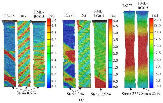 In Figure 9, the DIC images of TS275, RG, MPM, FML-RG, and FML-RGUD for different strain values are illustrated. Firstly, in Figure 9a, the comparison between TS275, RG, and FML-RG0.5 is illustrated and has been published previously [12]. It can be seen that the Lüders bands appeared in TS275 at strain values of 0.5%, while the monolithic RG shows a strain extension in the 45° direction. At a strain value of 2.0%, the steel sheet continues to deform plastically with the extension of the Lüders bands, while damage is already present in the monolithic RG, marked by the red arrow. In contrast, the FML shows damage in the core RG at a strain value of 2.9%. The steel sheet continued to be tensioned after the core RG fractured, with the fracture occurring at 26% of the strain value, close to that of the monolithic TS275 [12]. In Figure 9b, the DIC images for the samples of MPM and FML-RGUDX/-RGUDY are depicted. MPM shows the Lüders bands as the monolithic steel sheet, indicating the influence of core PA6 on the plastic deformation of the cover sheet TS275 is neglectable compared to the organosheet core in the FML-RG. In contrast, the FML-RGUDX0.5 showed similar strain evolution to the FML-RG0.5, except for the earlier fracture of RGUDX, marked by the red arrow in Figure 9b. Alternatively, the FML-RGUDY0.5 showed more pronounced strain evolution in the perpendicular direction to the sample length before the fracture occurred in the sample middle (marked by the red arrow). This is due to the higher transverse normal strain in RGUDY in comparison to RGUDX or RG [33,34]. As mentioned earlier, the plastic deformation of the cover in the FML-RGUDY is localised and therefore the total elongation of the cover is lower than the previous FML-RG and FML-RGUDX, see Figure 9b, with an elongation of only 16% for the FML-RGUDY compared to 26% for the monolithic steel sheet.