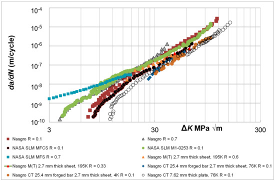 Since Inconel 718 is also widely used in space-related applications, let us next consider the effect of low temperatures on the da/dN versus ΔK curves associated with conventionally manufactured Inconel 718. To this end, Figure 4 presents a few selected da/dN versus ΔK curves taken from Figure 3 together with the following datasets that were extracted from the Nasgro database, viz: