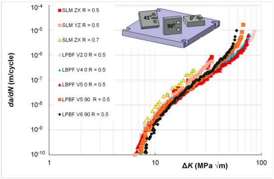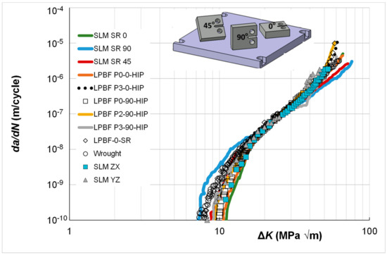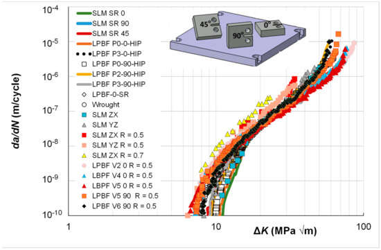 Figure 7 presents the R = 0.1 crack growth curves for both the AM specimens and the wrought material tested in [58]. Figure 8 presents the R = 0.5 and 0.7 curves given for this material. Figure 9 presents all of these curves on a single plot.