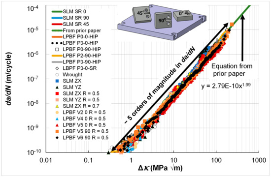 Figure 10 reveals that, regardless of the AM process, the R ratio, or the angle between the crack and the build direction, when da/dN is plotted as a function of Δκ, then the 20 different curves essentially collapse onto a single master curve that can be approximated by Equation (4). As previously, the values of ΔKthr and A used in Figure 10 were determined using the “Automated Total Least Squares” methodology described in [59]. The values of the parameters associated with these 20 tests are given in Table 3.
