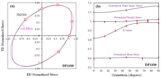 (a) The von Mises calibrated Yld2004 yield surfaces and (b) normalized stress ratios and R–values of Yld2004 in various directions for DP1180 with regards to the rolling direction. Symbols indicate the experimental data used for calibration.