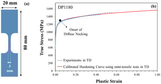 (a) Miniature tensile geometry used for hardening curve evaluation of DP1180 from Abedini et al. [41]. (b) Calibrated hardening curve for DP1180, obtained from the miniature tensile experiments, with the modified Hockett–Sherby (MHS) model (Equation (1)) and its coefficients reported in Table 3.