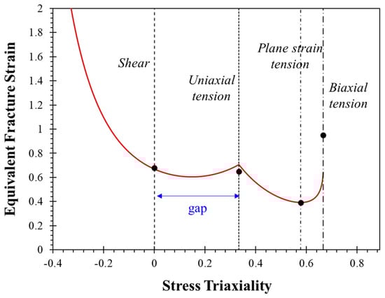 The process of fracture in ductile metals involves the nucleation, growth, and coalescence of microscopic voids, leading to a rapid drop in load–bearing capacity and ultimately causing fracture. Modelling of ductile fracture can be divided into physical and phenomenological approaches. In phenomenological approaches, fracture is considered a sudden event that occurs when the stress and strain states of an undamaged material reach a critical level. They are known as uncoupled models because the effect of damage on the plastic behavior is not considered [45]. These models are popular in industrial applications because they can be paired with any desired metal plasticity model, are easy to calibrate from physical tests, and can be efficiently implemented into finite element codes. Modified Mohr-Coulomb (MMC) type fracture models are built upon the existence of a proportional failure locus in plane stress, or failure surface in 3D loading, along with a damage accumulation function to account for non–linear load histories. Generally, the equivalent plastic strain is employed as the failure metric, and the stress state is identified by the stress triaxiality and Lode parameter [46].