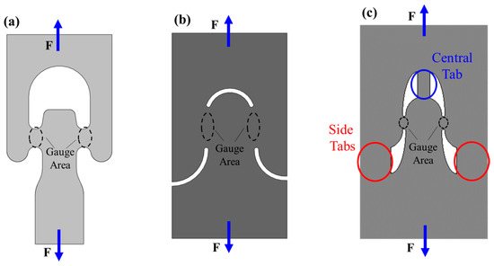 Figure 4a,b shows the initial design of the Shouler and Allwood [23] geometry, who performed a finite element analysis to predict the strain evolution in the gauge area. They then added the side tabs shown in Figure 4c to improve the linearity of the strain path. These tabs were designed to avoid failure in uniaxial extension before the gauge area fails in shear. The upper central tab was added to keep the sample in–plane using tests with a hemispherical punch and will be removed in the present work, which will use a universal tensile test frame.