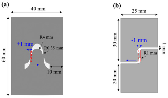 Figure 5b illustrates the original mini–shear geometry of Peirs et al. [52], where there is a −1 mm offset or eccentricity between the center of notches. The finite element evaluations of both geometries are provided in Section 3.2.