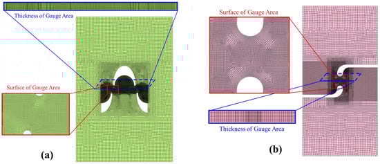 Discretized models of (a) SA + 1 and (b) MS–ZO geometries showing the elements of the gauge area in both surface and through-thickness views.