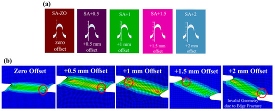 (a) Modified SA geometries based on horizontal offset between the notches (increasing offset size from left to right). (b) Equivalent strain contour of the Finite Element model depicting fracture initiation and the first failed element in the geometries of part (a).