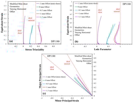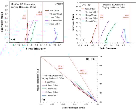 The numerical simulations were performed to investigate the optimal horizontal offset dimensions for modified SA and Peirs et al. [52] geometries that result in the desired stress and strain states. Figure 7a shows the different versions of SA geometry considered. The fracture initiation location or the first failed element is used to evaluate the performance of the geometry. Ideally, fracture will initiate within the center of the gauge region instead of near the edge, which implies a tensile–dominated failure. The fracture initiation locations are shown in Figure 7b, and the corresponding stress triaxiality, Lode parameter, and strain paths are shown in Figure 8. As the size of the offset increases, the stress and strain states move towards the uniaxial condition. Unfortunately, all geometries show fracture near the edge. The geometry with an offset of +1 mm was selected for experimental investigation due to its stress state being approximately mid–way between shear and uniaxial tension.