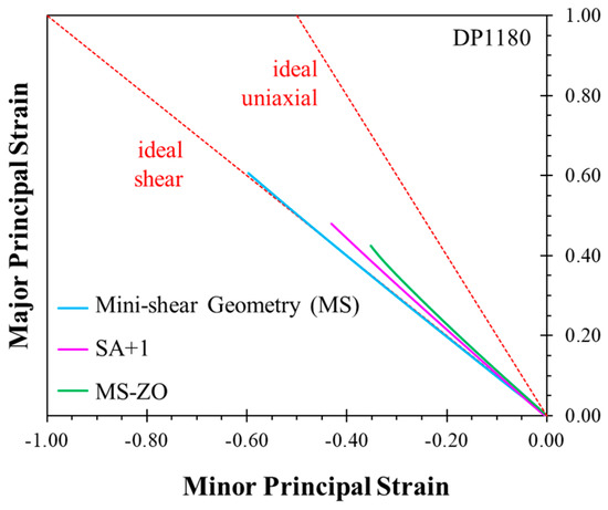 For simple shear, the ideal strain path is −1, which follows from the applied deformation gradient, while the path for uniaxial tension depends upon the tensile R–value. For the DP1180 in transverse direction (TD), the ideal strain path for uniaxial tension is approximately −1/2.