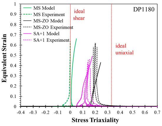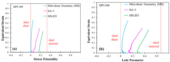 Figure 9a presents the modified Peirs et al. [52] geometries with horizontal offsets ranging from −1 to 1.5 mm. The stress and stress state of the first failed elements are presented in Figure 10a–c with their locations shown in Figure 11b. The mini–shear geometry (MS) shows an approximately linear strain path in simple shear with fracture initiation predicted to occur at the center of the gauge area. The zero–offset geometry (MS–ZO) provides a relatively constant stress state and linear strain path, with fracture predicted to initiate within the center of the gauge region. The stress and strain states in other geometries are closer to uniaxial tension. Consequently, the MS–ZO geometry was chosen for experimental evaluation in a combined shear–tension loading. The MS geometry was also evaluated experimentally in conjunction with the two shear–tension geometries to provide a reference for the shear fracture strain.