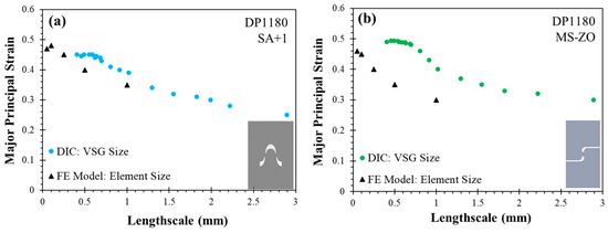 The effect of lengthscale in experiment (VSG) and in FE model (element size) on the major principal strain of the (a) SA + 1 and (b) MS–ZO geometries.