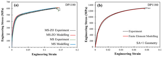 Figure 14a,b compares the experimental and numerical stress responses of MS–ZO and SA + 1 geometries until the onset of fracture. The nominal or engineering stress is calculated by dividing the force by the gauge area as in Equation (10). In this equation, τ represents the average stress, F denotes the applied force, t signifies the sheet thickness, and L corresponds to the length of the shear region, which is set to 3 mm. For the SA + 1 configuration, with two gauges present, the gauge area is doubled in Equation (10). Overall, the stress response was well predicted in all cases, which attests to the accurate calibration of the Yld2004 yield function and hardening model. Figure 15 illustrates the DIC and FE contours of the major principal strain before fracture in conjunction with the extensometer and point tools to extract the global and local responses of the geometries, respectively.