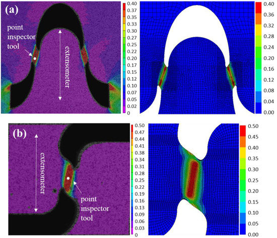 DIC and FE contours of major principal strain before fracture (a) in SA + 1 and (b) MS–ZO geometry. In the DIC evaluation, the point inspector tool was used to extract the local strain history as it was the maximum strain location.
