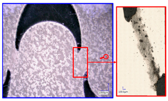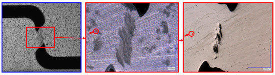 Identifying the location of fracture initiation in shear–dominated tests is challenging since the crack does not open as in tensile loading. To gain insight into the likely location of the fracture, two tests were halted after load drop and prior to rupture. The gauge region was then extracted from the coupons, mounted, polished, and viewed under an optical microscope to observe signs of microscopic void damage.