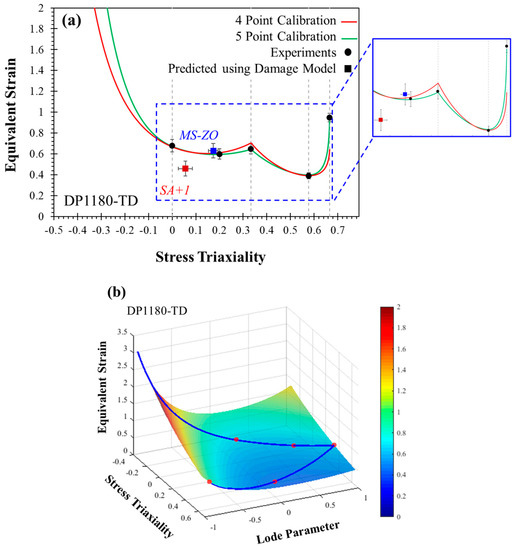 The DP1180 fracture locus of Section 2.3.3 is revisited to include the fracture strain of the MS–ZO in calibration of the MMC model in Equation (7). Figure 20a,b depicts the recalibrated plane stress fracture locus and 3D fracture surface, respectively. The five coefficients in the MMC model were identified using the five experimental fracture strains and are provided in Table 7. The predicted fracture strain and stress triaxiality of both combined geometries are shown in Figure 20a. The GISSMO damage model with the damage exponent of n = 2 was used to integrate the strain path of combined geometries. Although the SA geometry exhibited noticeable edge fracture, its fracture strain and average triaxiality offer conservative estimations for the fracture locus in combined simple shear and uniaxial tension. The experimental results of MS–ZO demonstrate a remarkable alignment with the recalibrated fracture locus, as illustrated. Moreover, the utilization of five data points for calibrating the fracture locus enabled a more accurate calibration in all of the stress states. It is noted that the fracture locus improved in equal biaxial tension as a consequence of the additional flexibility allowed by removing the constraint on used to reduce the MMC to four parameters in the original calibration.