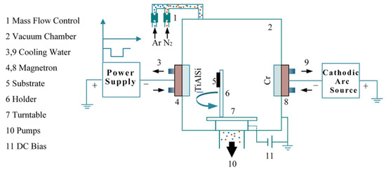 - Barshilia, H.C.; Yogesh, K.; Rajam, K. Deposition of TiAlN coatings using reactive bipolar-pulsed direct current unbalanced magnetron sputtering. Vacuum 2008, 83, 427–434. [Google Scholar] [CrossRef]