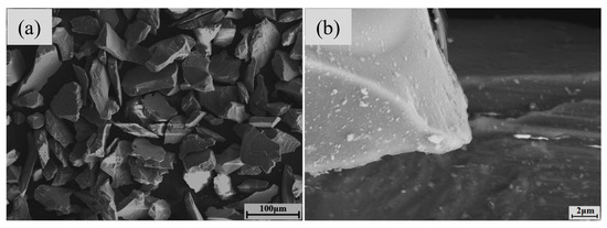 The micro-morphology of angular Al2O3 solid particles (a) and the sharp angular geometry of one single particle (b).