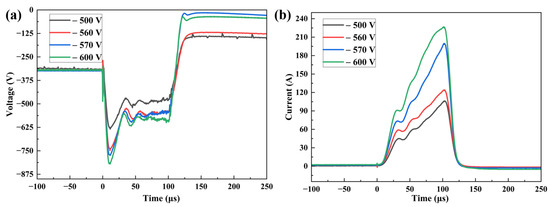 Another characterization should be noted during the pulse-off time that as the dc power supply was controlled by the constant power mode and set at 0.1 kW, the initial voltage output of the dc power supply was ~−310 V, as shown in Figure 3a, which was too low to ignite the plasma. Thus, the discharge current is hardly observed in Figure 3b during the pulse-off time. But after turning off the pulse, the voltage output became lower than that before turning on the pulse and decreased with the discharge voltage increase. This phenomenon was expected from the limited charging efficiency of the storage capacitor, which supplies power for the dc supply. Especially at the discharge voltage range of −570~−600 V, the discharge current of the pulse was up to more than 200 A, and the inefficient charging led to the voltage output decreasing to almost zero. Then after a ~125 μs lag, charging of the storage capacitor was finished; thus, the voltage output of the dc power supply was increased to ~−310 V again.
