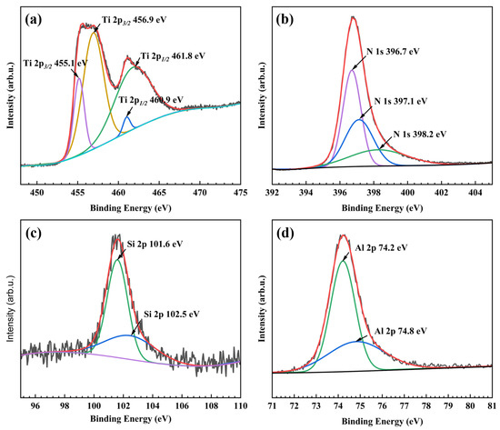 Thanks to the heavier mass of Ti atoms compared to Al and Si atoms, the re-sputtering yield of Ti content was relatively lower and its atomic ratio was higher than the other two contents. In addition, Figure 4 displays the high-resolution core level spectra for Ti, Al, Si, and N of the TiAlSiN-500 coating. In Figure 4a, the deconvolution of the Ti 2p peak indicated that it was composed of four peaks centered at 455.1, 456.9, 460.9, and 461.8 eV. The peaks centered at 456.9 and 461.8 eV originated from the Ti 2p3/2 and Ti 2p1/2 electrons in titanium oxynitride [44,45]. The two peaks at 455.1 and 460.9 eV corresponded to TiN [19]. Figure 4b shows the Al 2p spectra at 74.2 eV assigned to the Al-N bond and a weak Al 2p signal at 74.8 eV corresponding to the Al-O bond [46]. The Si 2p spectrum consisted of two peaks centered at 101.6 and 102.5 eV, as shown in Figure 4c, corresponding to the Si3N4 phase [47] and SiO2 phase [19]. The O content may be from the trace residual oxygen in our deposition chamber. The N 1s spectrum of the TiAlSiN coating revealed the three characteristic peaks at the banding energies of 396.7, 397.1, and 398.2 eV, which were identified as AlN, TiN, and Si3N4 phases in several studies [19,48].