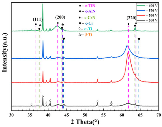 The phase constituents of the TiAlSiN coatings fabricated at various discharge voltages were determined by an X-ray diffractometer and are displayed in Figure 5. It is obvious that the TiAlSiN coatings exhibited the diffraction peaks of the standard face-centered cubic TiN (c-TiN, #JCPDF38-1420) and cubic AlN (c-AlN, #JCPDF25-1495). Meanwhile, the peaks of the buffer layer CrN (c-CrN, #JCPDF11-0065), Cr (c-Cr, #JCPDF06-0694), and the titanium alloy TC6 substrate (α-Ti, #JCPDF44-1294, β-Ti, #JCPDF44-1288) were also noticed and tagged. All coatings exhibited a NaCl-type crystal structure but with a diffuse scattering peak, which indicated coatings with a nanocrystalline structure. The silicon-related phases could not be matched in the diffraction peaks. Based on the above analysis by XPS, it suggested that Si atoms formed an amorphous Si3N4 phase. The XRD and XPS results implied that the prepared TiAlSiN coatings may be nanocomposite structures composed of nc-TiN and a-Si3N4.