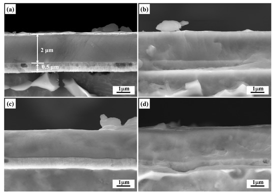 To investigate the cross-sectional microstructure and thickness of the TiAlSiN coatings, SEM images were collected in an SE mode and are shown in Figure 6. The coating structure is distinguished by the light and dark layers. The light layer is the mixture of the Cr + CrNx buffer layer, with a thickness of ~500 nm. The dark layer is the TiAlSiN coating, with a thickness of ~2 μm. The overall thickness of whole coating on the TC6 substrate was measured to be ~2.5 μm. All prepared TiAlSiN coatings exhibited a dense and smooth structure, almost free from columnar structure, which fit well with the nanocomposite (nc-TiN/a-SiNx) structures in previous studies [26,55,56]. With the increase in discharge voltage, enhanced ion bombardment not only inhibited the growth of columnar formation but also refined the grains inside the TiAlSiN coating. Hence, the microstructure became denser and denser. The deposition rate was unfortunately reduced from 33 to 25 nm/min when the discharge voltage was increased from −500 to −600 V, as shown in Table 2.