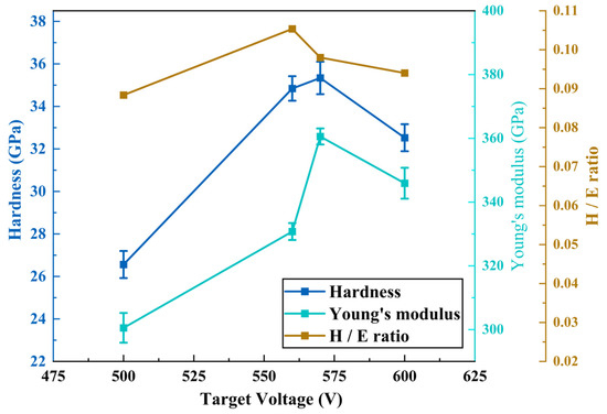 The hardness, Young’s modulus, and H/E ratio of the TiAlSiN coatings dependent on various discharge voltages were evaluated by a nanoindentation tester and are illustrated in Figure 7. It is obvious that the hardness and Young’s modulus of the prepared coatings continuously increased to the maximum values of 35.34 ± 0.63 and 360.6 ± 2.5 GPa, respectively, as the discharge voltage increased to −570 V, whereas further increasing the discharge voltage to −600 V caused their values to decrease respectively. Although the mechanical properties of the prepared coatings were influenced by many factors including phase composition, microstructure, residual compressive stress, etc., they were determined by some dominant factors under certain conditions. In our cases, for the TiAlSiN-500 coating, the high fraction of amorphous structures caused the lowest hardness (28.16 ± 0.64 GPa) and Young’s modulus (300.5 ± 4.6 GPa), which seemed to be consistent with the reports in the Introduction where a high content of amorphous phases can degrade the coating coherence. With increasing the discharge voltage to 560 V, the better crystallinity and (220) plane preferred orientation of the FCC structures confirmed the hardness and Young’s modulus increasing to 34.85 ± 0.58 and 330.7 ± 2.7 GPa, respectively [20,49,50]. For the TiAlSiN-570 coating, the more refined grains and introduced residual compress certified the hardness and Young’s modulus arriving at their maximum values. In addition, the increment of Young’s modulus between TiAlSiN-560 and TiAlSiN-570 was larger than that between TiAlSiN-500 and TiAlSiN-560. For the TiAlSiN-600 coating, the (200) preferred orientation and increased residual stress resulted in the hardness and Young’s modulus reversely decreasing to 32.53 ± 0.63 and 355.9 ± 4.8 GPa, arising out of the higher Schmid factor (200) plane compared with the (220) plane [51,55].