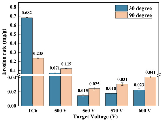 To evaluate the erosion resistance of the TiAlSiN coatings with various discharge voltages relative to the TC6 substrate, average mass loss rates were calculated and are shown in Figure 8. Generally, the maximum erosion rate appears at low angles of incidence (15°~45°) for ductile materials [58] and at a normal angle of incidence (90°) for most brittle material [59]. Hence, impingement angles of 30° and 90° for solid particle relative to sample surface were chosen for the erosion test. The TC6 titanium alloy substrate suffered more mass loss at the impingement angle of 30° sand erosion, which corresponded to its ductile nature. The TiAlSiN coatings experienced more mass loss at the impingement angle of 90° sand erosion, confirming their brittle nature. All TiAlSiN coatings presented protection benefits for the TC6 titanium alloy. The erosion rates of the TC6 substrate were 0.682 ± 0.003 and 0.235 ± 0.002 mg/g at the impingement angles of 30° and 90°, respectively, which were about 9 and 2 times more than that of the TiAlSiN-500 coating. When increasing the discharge voltage to −560 V, the prepared TiAlSiN-560 coating displayed erosion rates with values of 0.015 ± 0.002 and 0.025 ± 0.002 mg/g at the impingement angles of 30° and 90° sand erosion, respectively, which were only 1/45 and 1/9 of the TC6 substrate. As the discharge voltage further increased to −570 and −600 V, the erosion rates rose gradually, reaching 0.023 ± 0.002 and 0.041 ± 0.002 mg/g, respectively, for the TiAlSiN-600 coating at 30° and 90° sand erosion, respectively, corresponding to 1/30 and 1/5 of the TC6 substrate. The TiAlSiN-560 coating displayed the minimum erosion rate, which meant that it possessed the best erosion resistance and can be the optimal protection for the TC6 substrate among the prepared samples. The trend of coating erosion resistance was consistent with that of the H/E ratio under various discharge voltages. It revealed that the highest H/E ratio of the hard coating can ensure its excellent erosion resistance, which was compatible with previous reports [26,60].