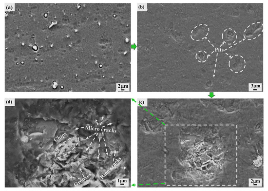 The erosion damage evolution and characteristics were deduced based on the morphology investigation of the TiAlSiN coatings before and after erosion damage by SEM. Figure 9 shows the damage evolution of the TiAlSiN-500 coating at 90° sand erosion. The as-deposited TiAlSiN coating presented some nodule and hole-like defects on its surface, as shown in Figure 9a, which might have come from some arcing, the change of target surface morphology, and the re-deposited insulated TiAlSiN coating on the target surface [61,62]. These defects could facilitate crack initiation during particle erosion, leading to the premature damage of the coating [63,64]. Then the amount and size of the micro pits increased on the coating surface after the early stages of erosion, as shown in Figure 9b, decreasing the coherence of coating. In the following sand erosion, these micro pits were broadened and presented a severely damaged area in the center, as displayed in Figure 9c. From the morphology of enlarged area in its center, as indicated in Figure 9d, numerous micro cracks and chips can be observed, and somewhat ringed cracks are present around the edge of eroded pit. These cracks were caused by the tensile stress formed during particle impingement [65]. As erosion proceeded, these cracks may have propagated and coalesced, resulting in coating failure and substrate exposure.