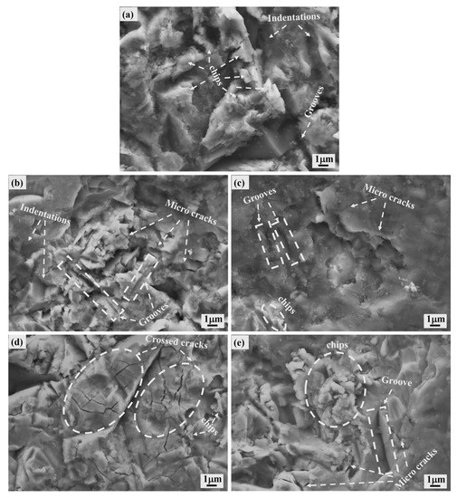 To evaluate the failure mechanism and damage degree of the TiAlSiN coatings dependent on discharge voltage at 90° sand erosion, high-magnification morphologies of the center part in the erosion pit were collected and are shown in Figure 10. For the TC6 substrate, we can clearly note deep indentations and lots of chips on their sides, as displayed in Figure 9a. Because of the high ductility of the TC6 substrate, the material was easily indented and the indentations were deep with the emergence of extruded lips. Most of these lips were forged into chips by the repeated impacting of solid particles, resulting in the substrate material removal. This indicated that the dominant material removal of the mechanism at 90° sand erosion was the material plastic deformation and work hardening during the repeated impacts of the solid particles [66]. In comparation, the eroded coatings presented shallower indentations, finer fragmentary chips, and more micro cracks, which were the brittle fracture characteristics of the ceramic hard coating [67].