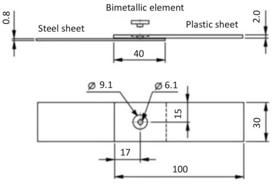 Experimental RES technology was applied to the production of combined joints of galvanized steel sheet/thermoplastic (Figure 2). PMMA thermoplastic (trade name QUINN XT) with a thickness of 2 mm was used. The manufacturer declares a strength of 70 MPa and an elongation at break of 4% []. To place the bimetallic element, holes with a diameter of 6.1 mm and a recess of 1 mm with a diameter of 9.1 mm were pre-drilled into the pieces with dimensions of 30 mm × 100 mm (Figure 2).