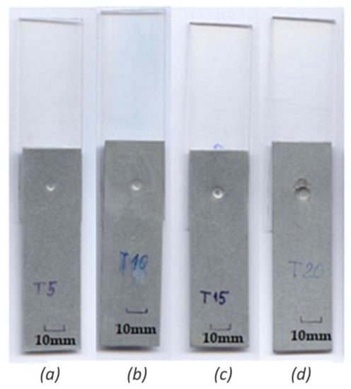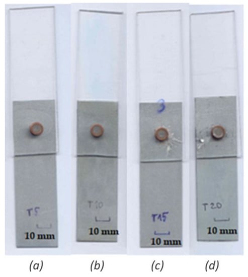 General view of RES joints (steel/PMMA) with bimetallic element (Cu/Sn60Pb40) from the face (front side): (a) T5 (t = 0.1 s), (b) T10 (t = 0.2 s), (c) T15 (t = 0.3 s), and (d) T20 (t = 0.4 s).